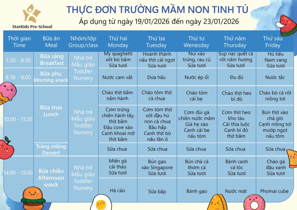 Dinh dưỡng không chỉ quan trọng cho sự phát triển về chiều cao, cân nặng, mà còn là yếu tố không thể thiếu cho sự phát triển của não bộ và tư duy. Hoạt động của não bộ tiêu tốn rất nhiều năng lượng. Não tiêu thụ 20% toàn bộ năng lượng hoạt động của cơ thể. Tại StarKids, trẻ được cung cấp một chế độ dinh dưỡng cân bằng bao gồm đầy đủ các chất đạm, béo, tinh bột, trái cây tươi và rau quả.