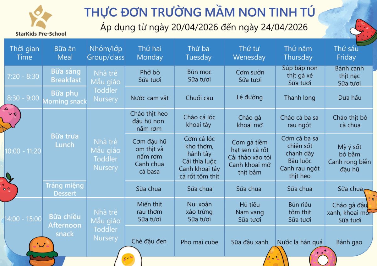 Bếp ăn StarKids được tổ chức nấu tại trường để đảm bảo sự tươi ngon và an toàn. Toàn bộ quy trình vận hành bếp ăn được thực hiện theo tiêu chuẩn nghiêm ngặt bởi công ty International School Foods, một công ty chuyên về chế biến suất ăn học đường cho các trường học tư thục và quốc tế có uy tín hàng đầu hiện nay như trường Quốc tế Mỹ, trường SuperKids.